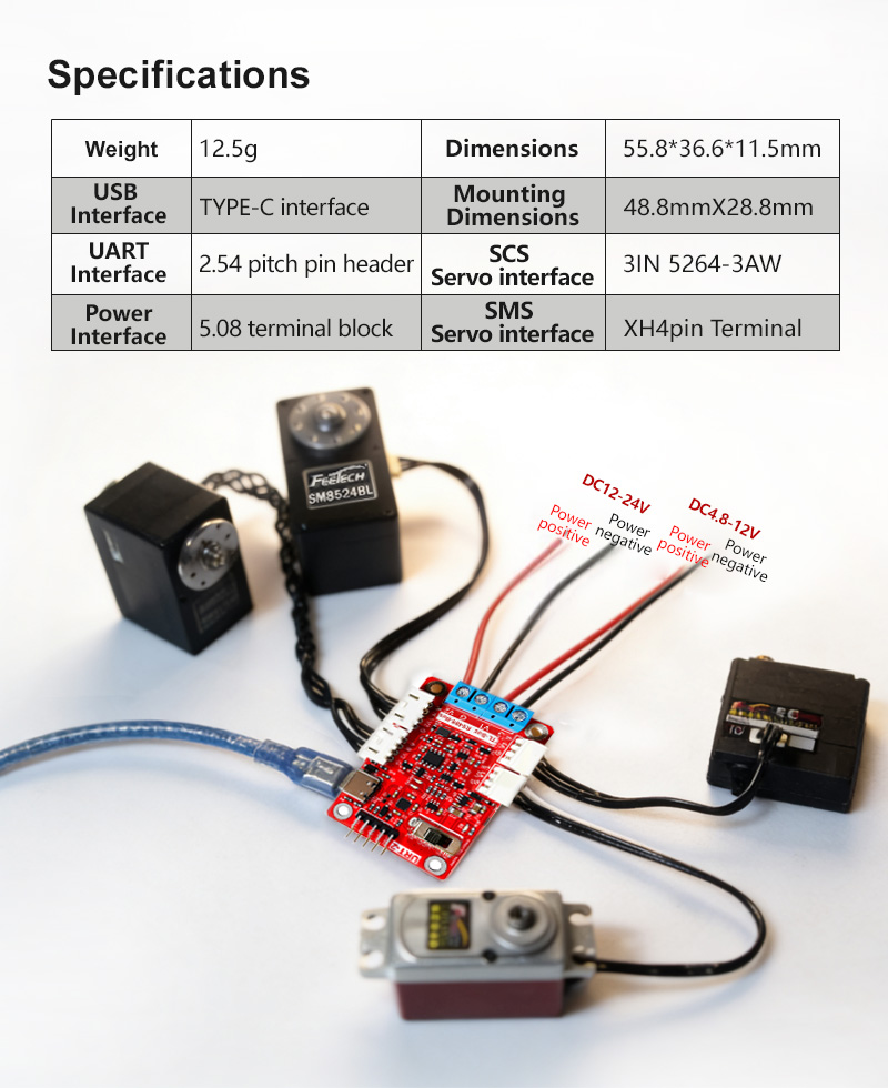 USB port using USB MINI interface; UART interface with 2.54 row spacing general; SMS series servo interface using 5264-4AW interface can be directly connected to the steering gear; SCS series servo interface using 5264-3AW interface can be directly connected to the steering gear.