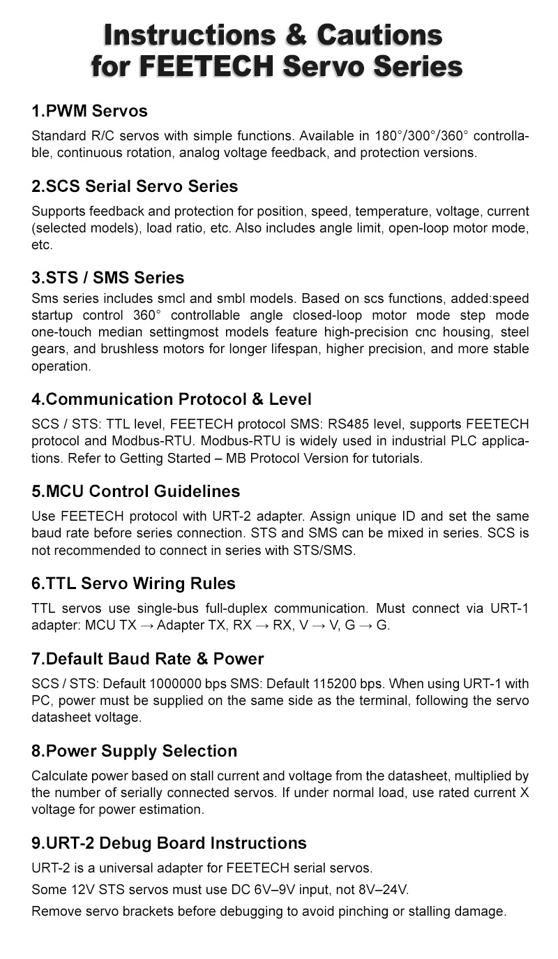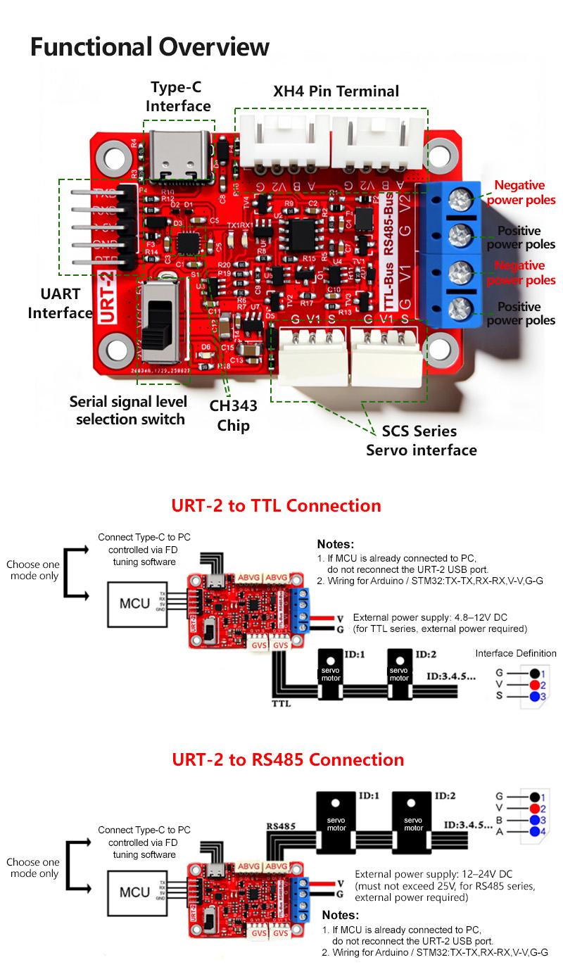 Because the power port has overcurrent limit, the maximum is 6A, so it is necessary to do additional power distribution processing in the actual application of the serial connection of more servos. URT-1 is only used for signal conversion.